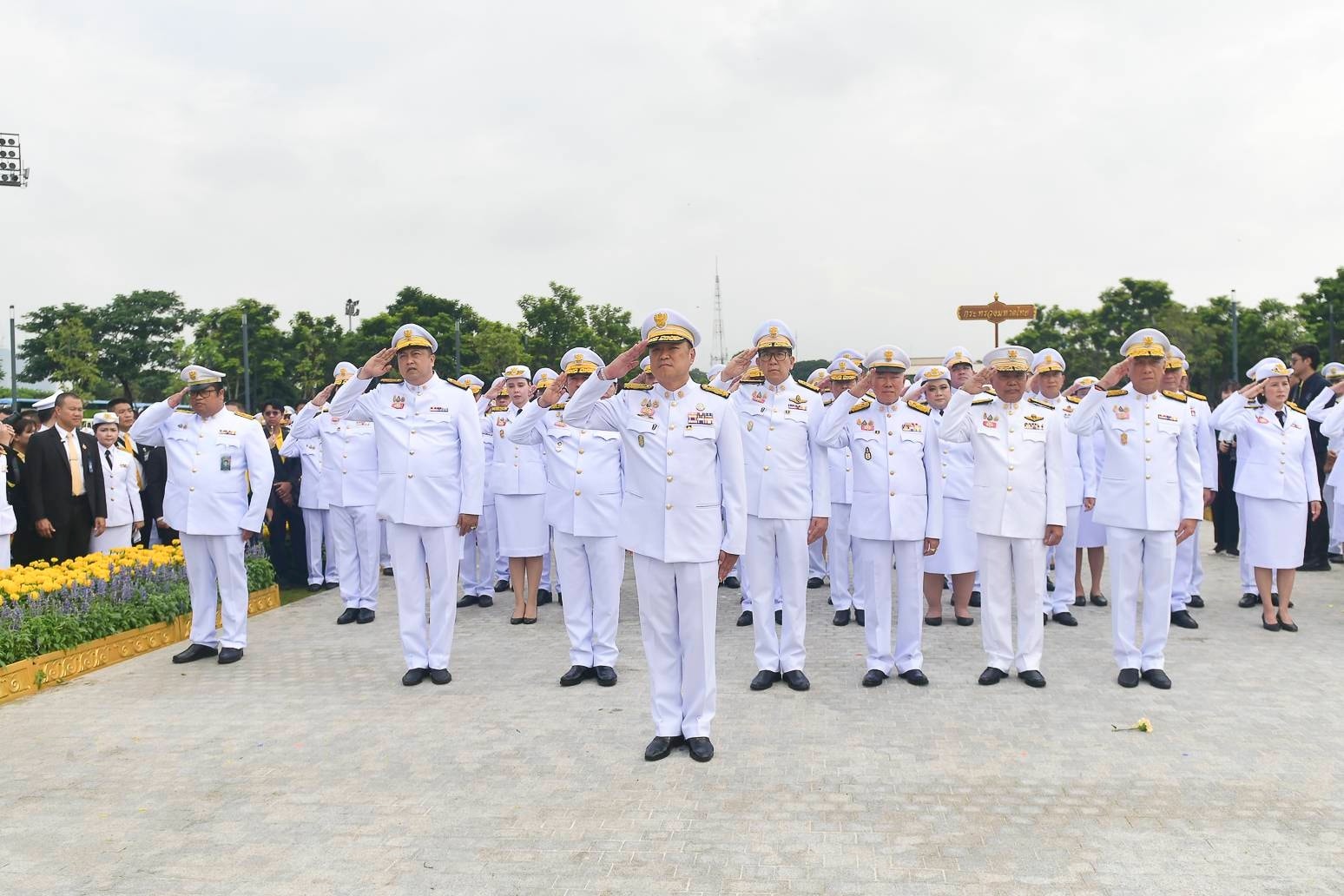 阿努廷总理及内阁成员向已故九世王普密蓬·阿杜德国王陛下的铜像行礼致敬,并代表总理及内阁敬献花圈两束,随后集体合影留念。